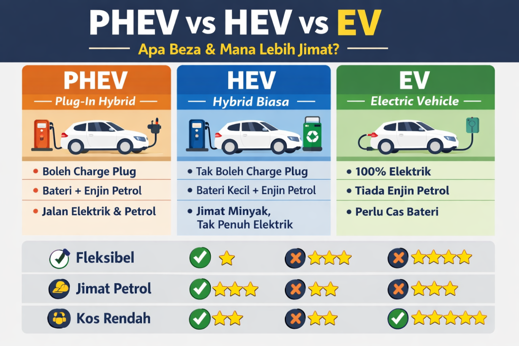 Perbandingan PHEV vs EV vs HEV menunjukkan tiada satu jawapan sesuai untuk semua. EV paling jimat, HEV paling mudah, dan PHEV paling fleksibel. Pilih berdasarkan gaya hidup, jarak pemanduan dan kemudahan yang anda ada.